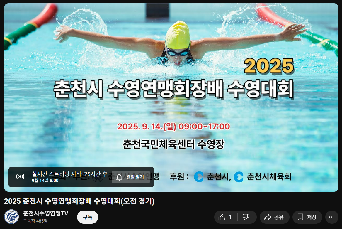 공지사항 이전으로 [유튜브_LIVE방송안내]일반부_2025년춘천시수영연맹회장배수영대회_오전경기 작성자 마스터 작성일 2025-09-13 조회 483회 [유튜브_LIVE방송안내]2025년춘천시수영연맹회장배수영대회_일반부2025년 9월 14일 오전 경기 8시 방송 https://www.youtube.com/watch?v=3Gw8A4ptxmE 첨부파일