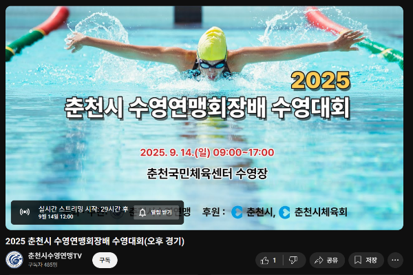 [유튜브_LIVE방송안내]2025년춘천시수영연맹회장배수영대회_일반부 2025년 9월 14일 오후 경기 12시 https://www.youtube.com/live/WN43JO ...